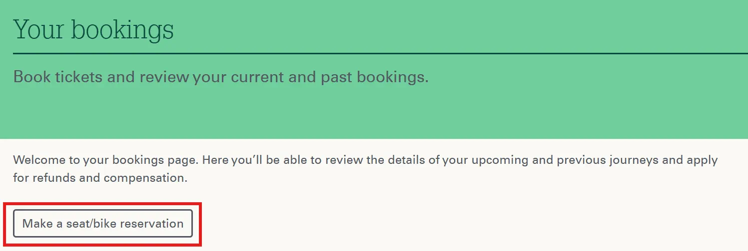 To reserve a seat, you must create a user account. After successful login, you can select a connection and reserve it via the Bookings menu using the Make a seat/bike reservation button. When choosing a ticket, you can select any ticket according to the desired class.
